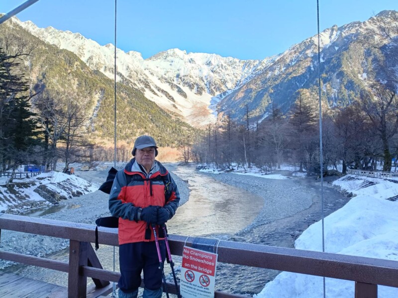 連休初日、釜トンネルから歩いて上高地に入り、日の当たらない寒い梓川沿いの道を歩き、河童橋あたりに来ると、ようやく陽が当り始め、風も吹かず、雪景色の西穂、奥穂、前穂高岳の稜線を眺めながら明神橋まで雪道を楽しみながら歩きました。途中の眺めの良い地点で、持参したコンロでお汁粉を作って美味しく食べてから下山、沢渡で車を回収して温泉にも寄って疲れを取り帰宅。良かったです。